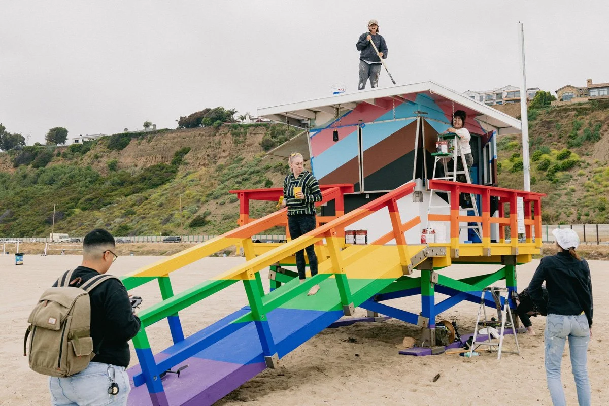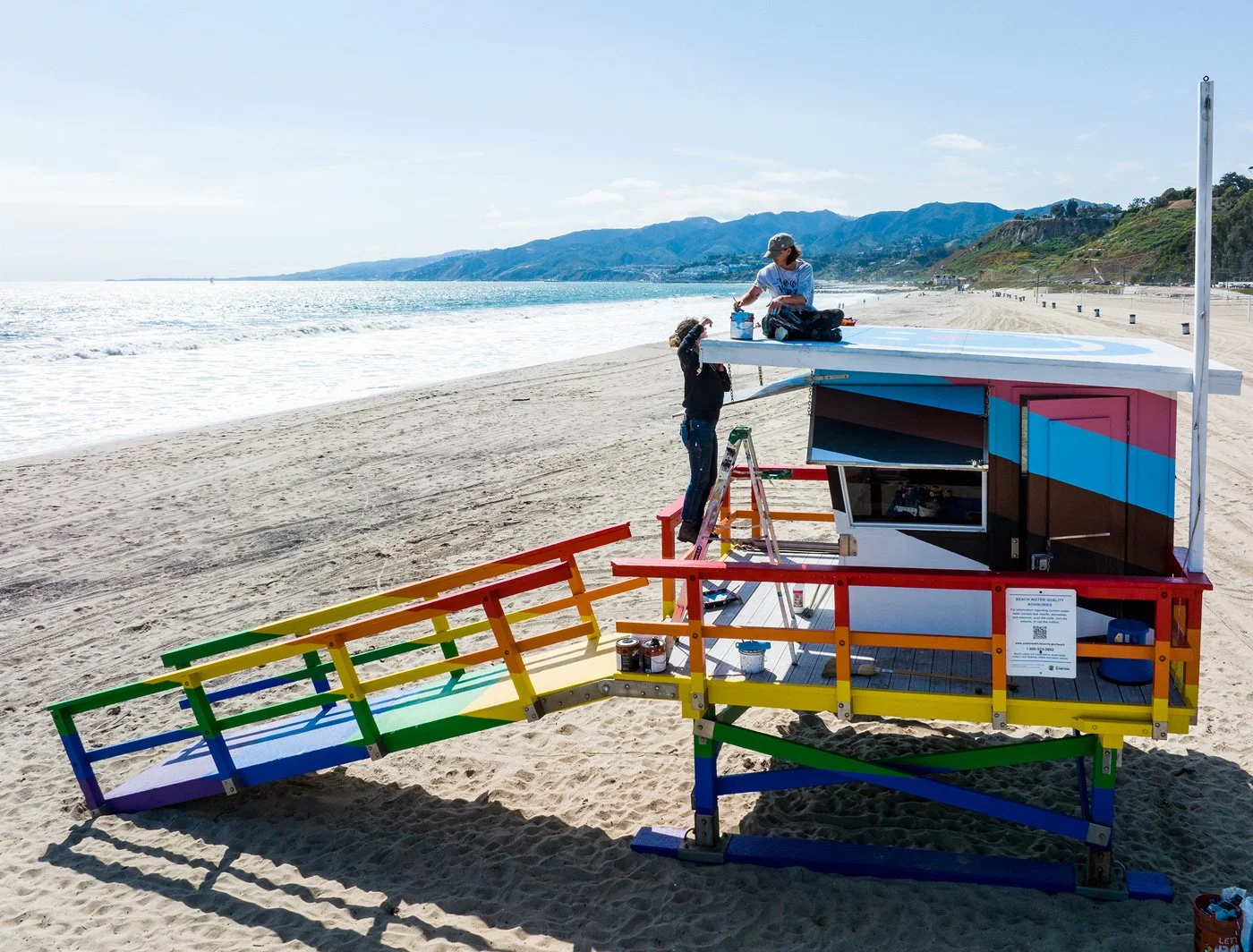 Will Rogers / Ginger Rogers Beach Santa Monica, CA 2023. pride progress murals on lifeguard towers 17 and 18.